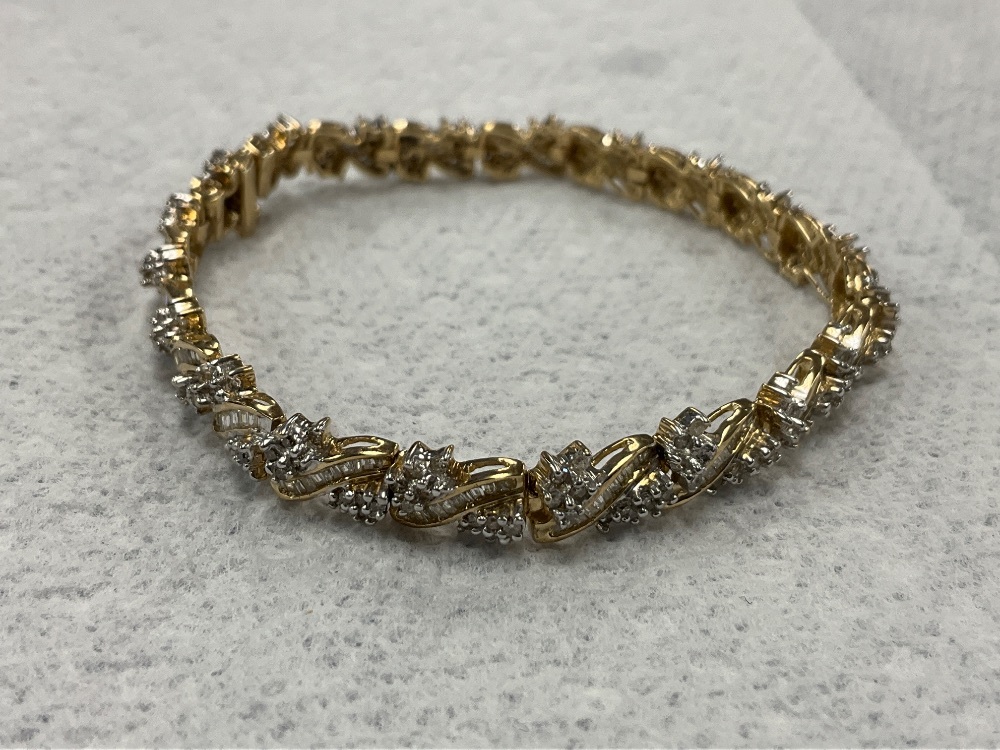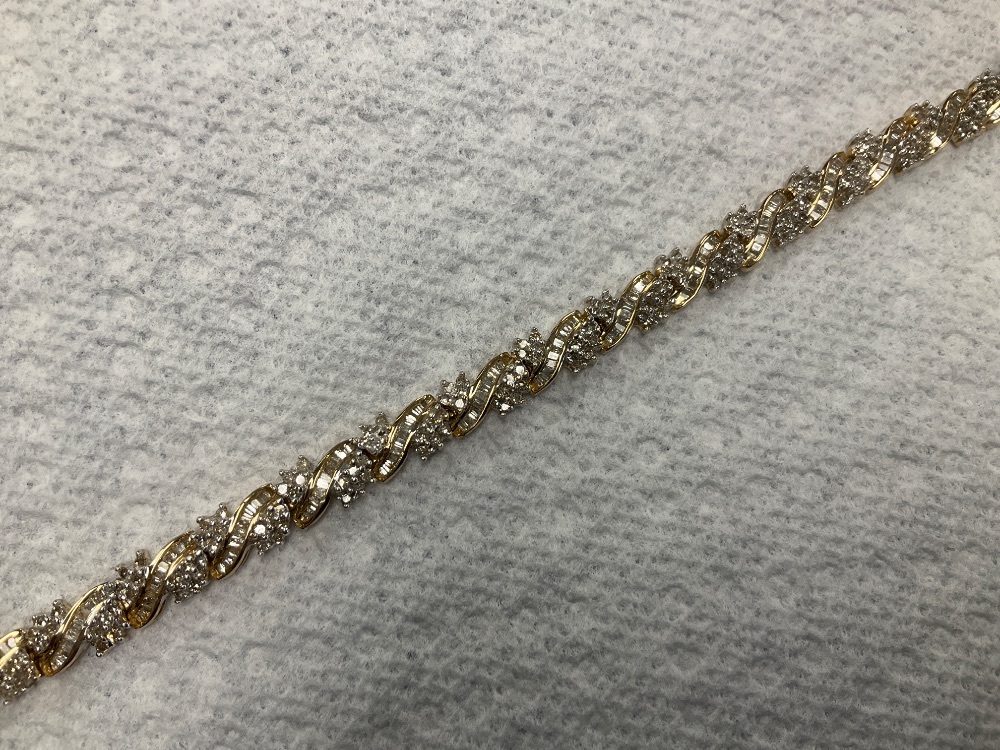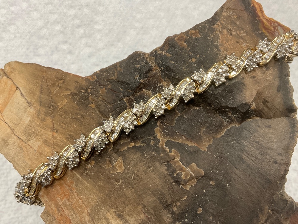 10K Two Tone Round & Baguette Diamond 7" Bracelet 15gr