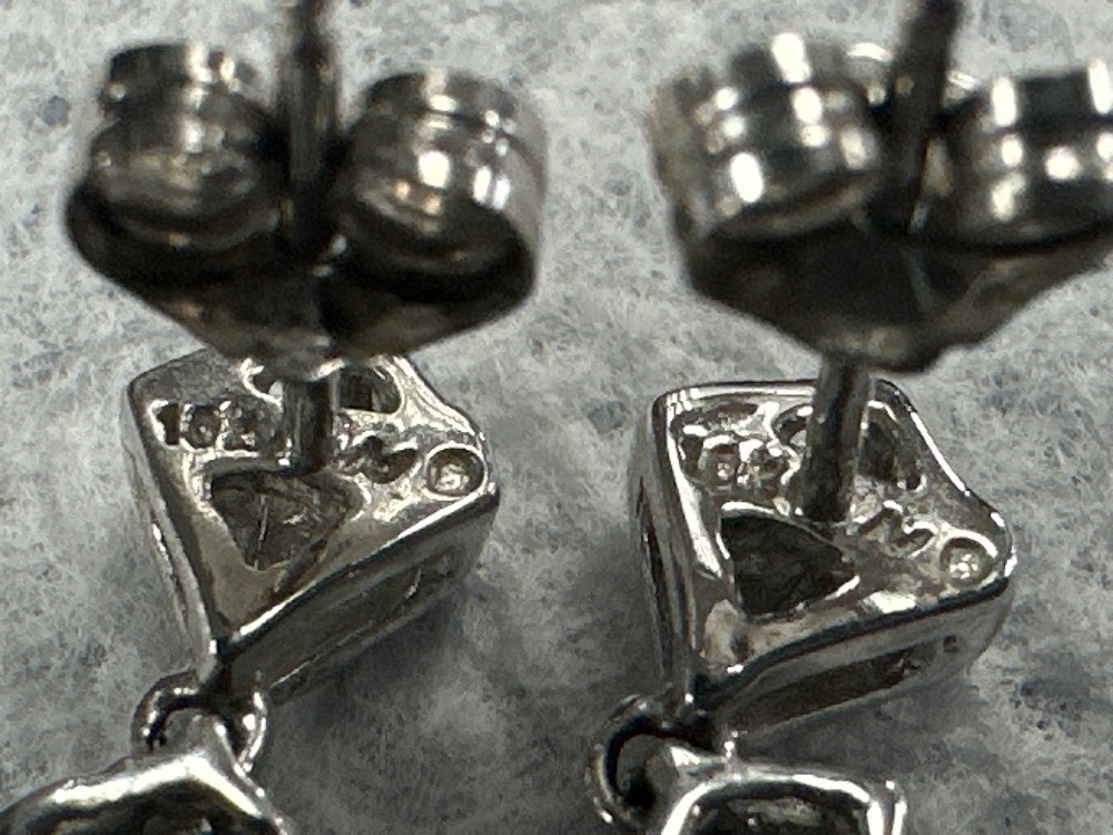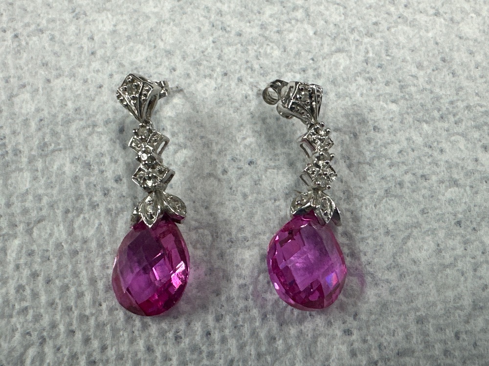 10kt WG Pink Stone Diamond Dangle Earrings 4.3Gr- 14 White Round Faint Color I2/I3 Diamond 1.00pts. 0.140cts. 0.03g 2 Red/Pink Pear Non-Diamond 300.00pts. 6.000cts. 1.20g