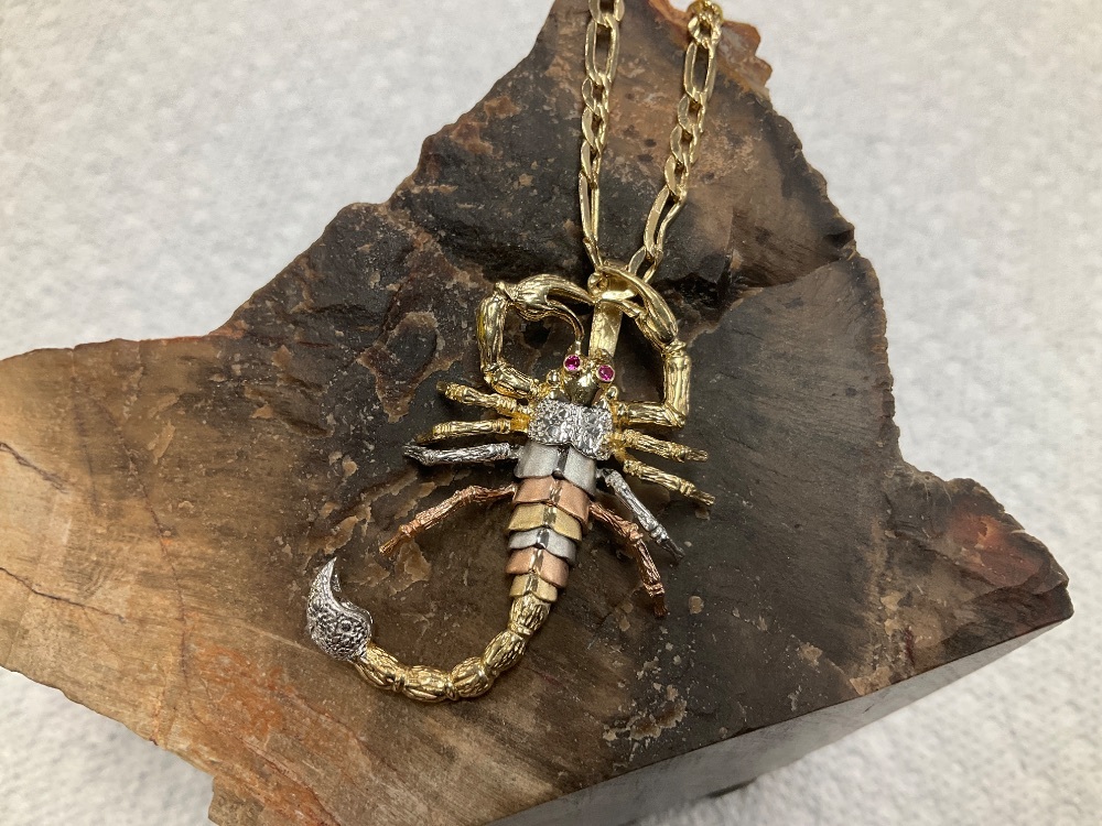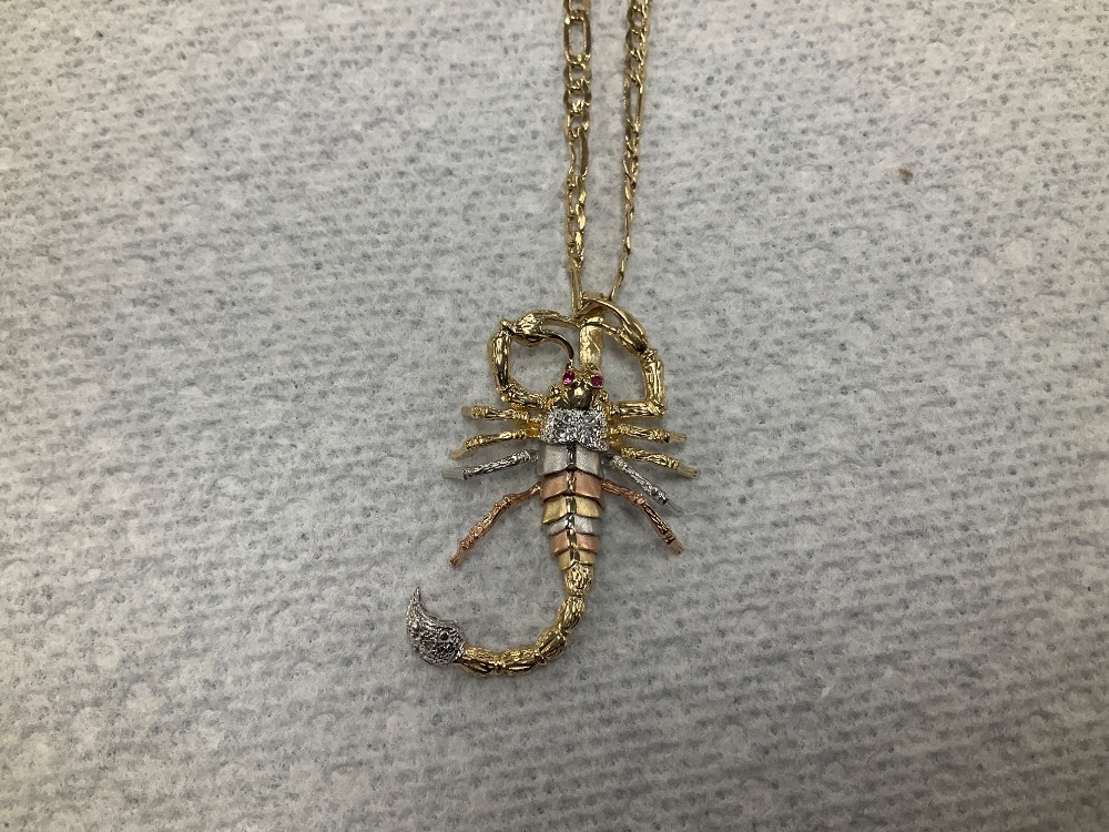 14K Tricolor Scorpion Pendant w/ 24" Yellow Gold Figaro Necklace 11.5gr