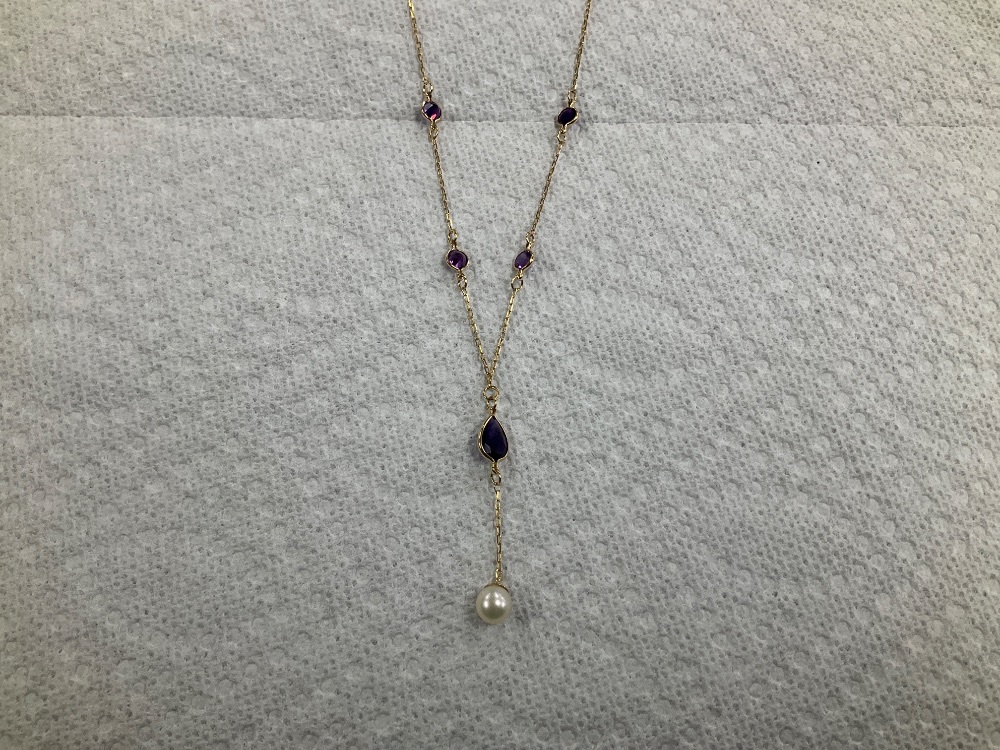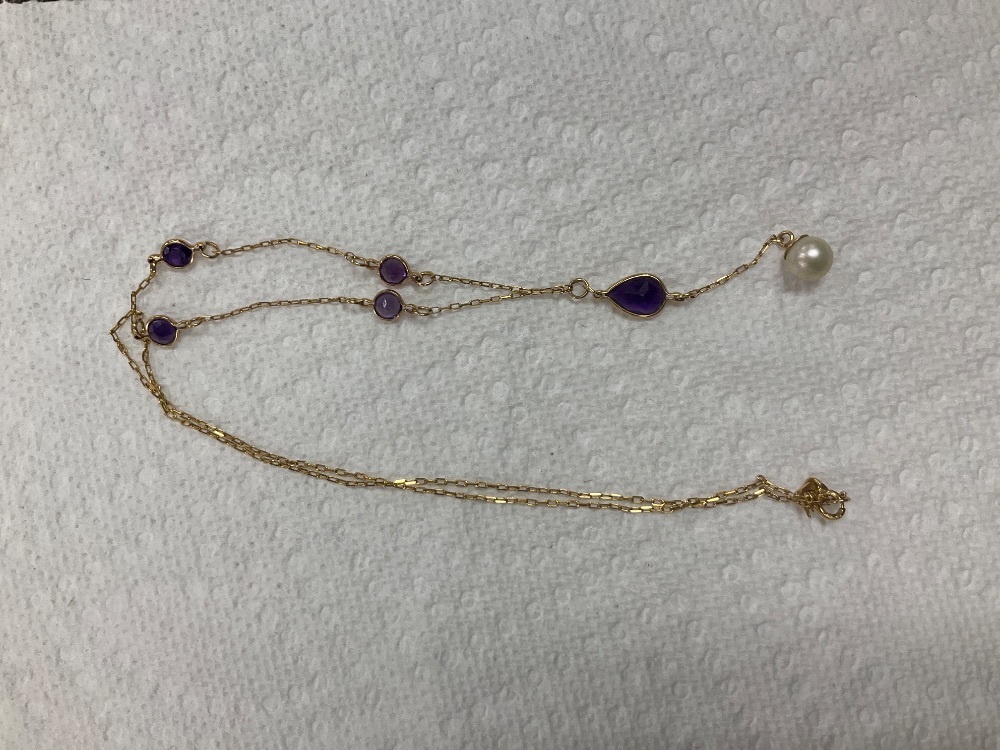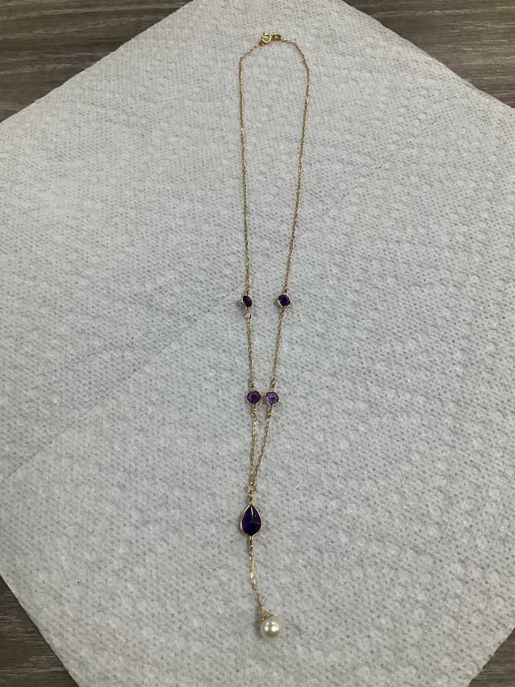 14K Yellow Gold Purple Stone & Pearl Necklace 3.8gr 21"