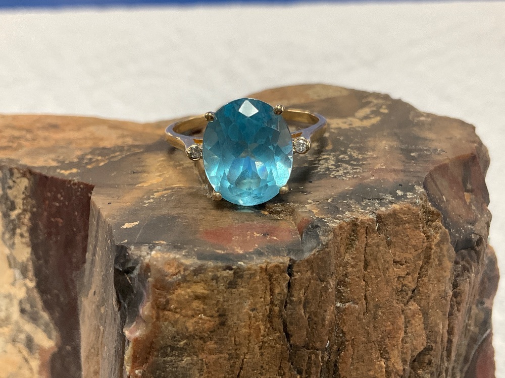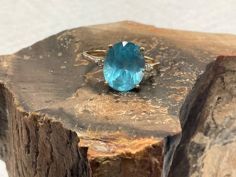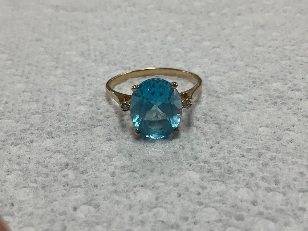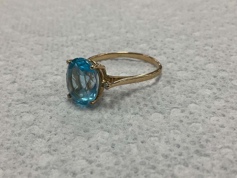 14K Yellow Gold Solitaire Blue Stone Ring 3.7Gr with Diamond Accents Size 10.25