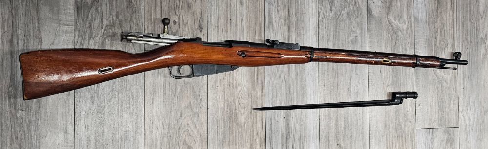 The 1934 Mosin Nagant 7.62x54R 91/30, a classic Russian rifle, comes complete with a bayonet. Renowned for its durability, precision, and potent 7.62x54R cartridge, this rifle serves as a piece of military history and a reliable firearm.