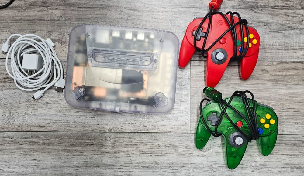 Introducing the Analogue A3D Funtastic N64. A throwback gaming console that comes with two controllers, enabling shared fun. Experience vintage gaming with advanced 3D technology. Immerse in nostalgia with this high-quality device. It's a perfect addition to any gaming collection.