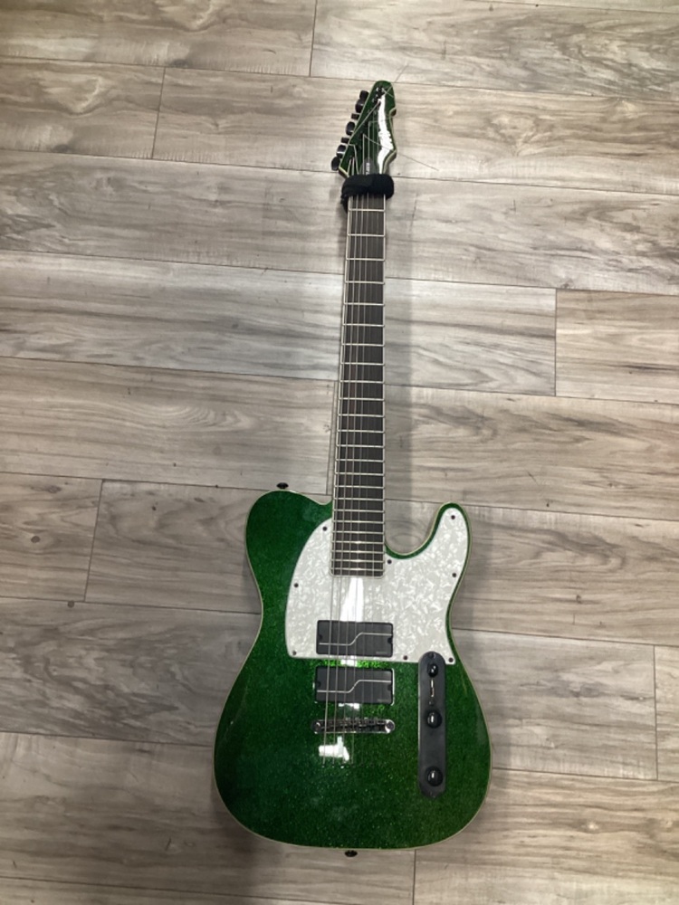 The ESP LTD SCT-607B Stephen Carpenter Electric Guitar, complete with its original case, is a seven-string, baritone model featuring neck-thru-body construction, alder body, and a three-piece maple neck. It stands out with its Fishman Fluence SRC Signature active pickup set, delivering a plethora of robust tones.