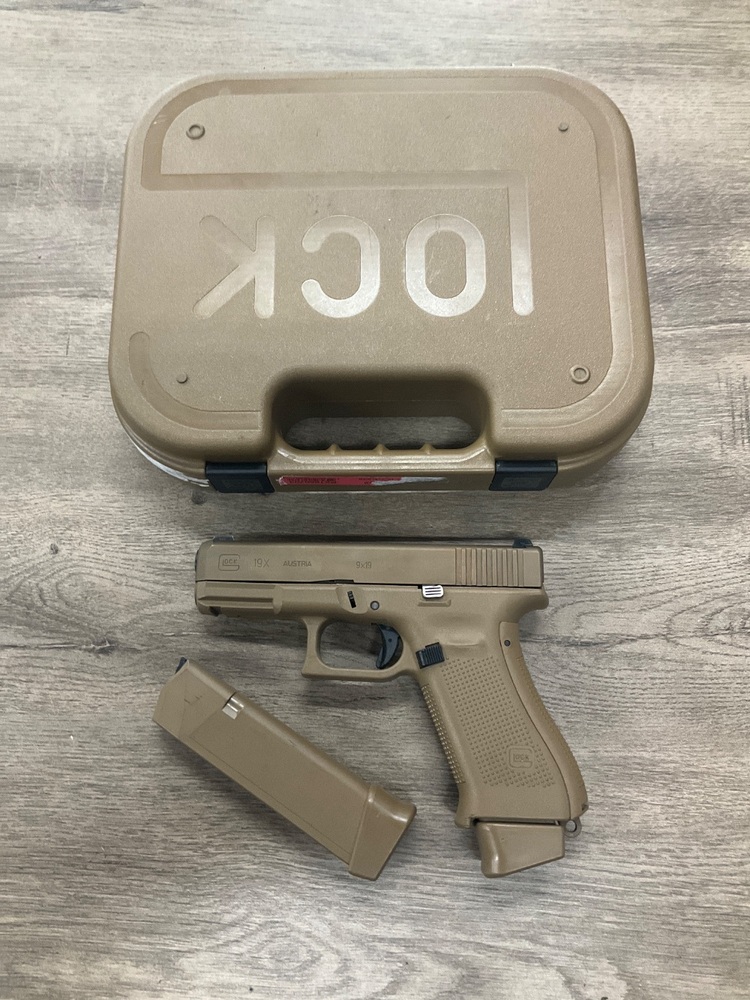 Log#12239 glock Pistol Semi Auto 9 MM Cal. 19X Finish: Flat Dark Earth WITH 2 MAGS AND CASE Loc:HTOP