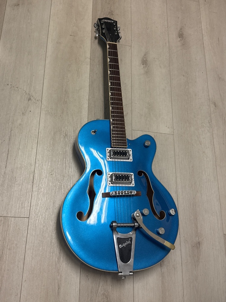 The Gretsch 5420T electric guitar features a hollow body design, Maple construction, Rosewood fretboard, and Bigsby B60 vibrato tailpiece. Its Filter’Tron pickups offer an iconic, crisp sound, making it perfect for rockabilly, jazz, and country music. Sleek vintage stylings give it an emblematic Gretsch aesthetic.