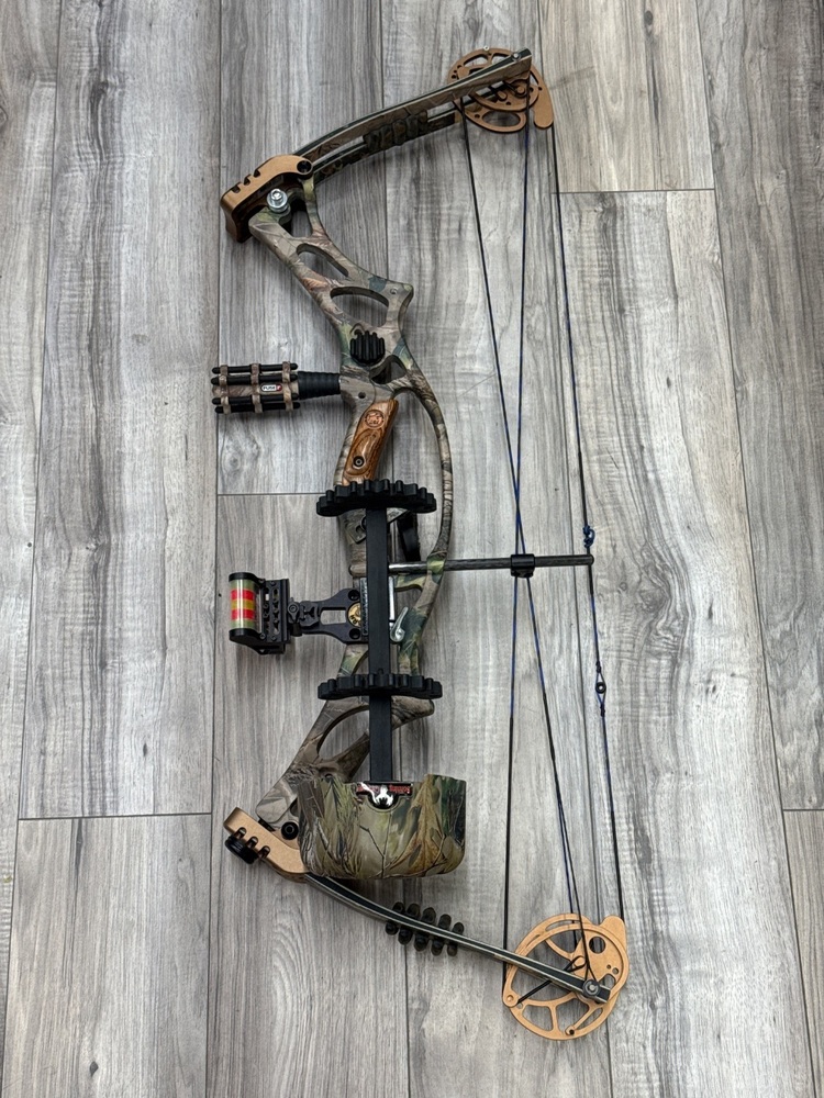 The Hoyt XT500 compound bow is a high-speed, accurate, and lightweight weapon, notable for its durability and easy-handling. It features a cam and a half system, ensuring a smooth and less aggressive draw cycle. Ideal for hunting and archery.