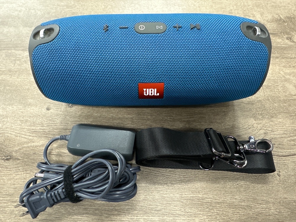 JBL Xtreme portable Bluetooth speaker features superior sound, durable fabric, waterproof design, charges devices, includes an aftermarket charger.
