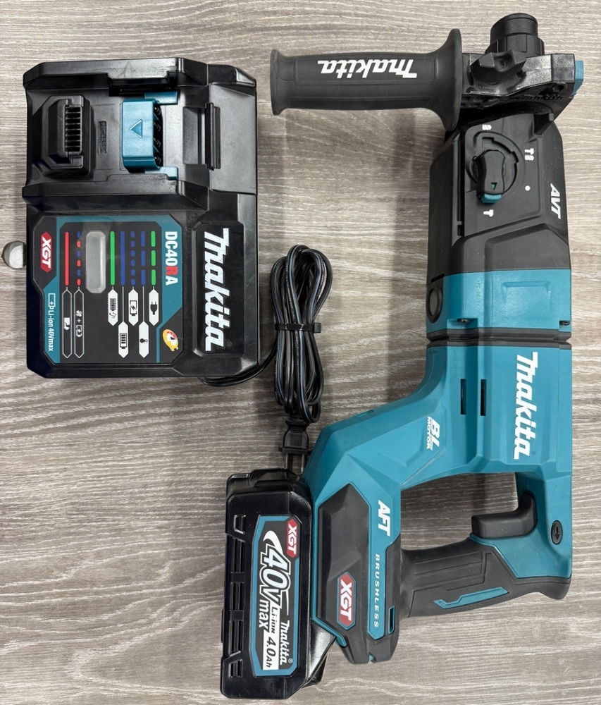 The 40V max XGT Brushless 1-1/8 in. AVT Rotary Hammer Kit (GRH07M1) is a cordless concrete solution engineered for heavy-load applications. It delivers the power, speed, and run-time for corded demands, and features a convenient D-handle design that is ideal for overhead, downward or hard-to-reach horizontal drilling/chipping applications. The Makita-built brushless motor delivers a full 2.7 ft. lbs. of impact energy, with 0-980 RPM and 0-5,000 BPM. Constant speed control automatically applies additional power under load for optimum performance. It's equipped with Active Feedback-Sensing Technology (AFT), which electronically turns off the motor if rotation of bit is suddenly forced to stop, and Anti-Vibration Technology (AVT) for reduced vibration. More than just a padded handle, AVT is an internal counterbalance that uses air pressure to move counterweight pistons in the opposite direction of the drive piston to actively reduce vibration. In addition, the vibration-absorbing back handle and side handle further reduce vibration. For added durability in harsh job site conditions, Extreme Protection Technology (XPT) is engineered for improved dust and water resistance.