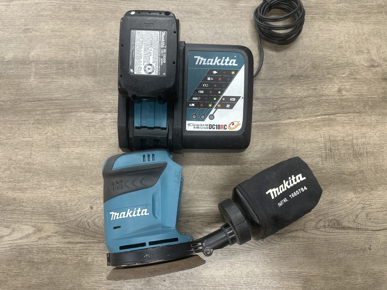 Makita 18V Random Orbit Sander, equipped with 2Ah battery, charger, and dust bag, ensures efficient, smooth sanding operations.