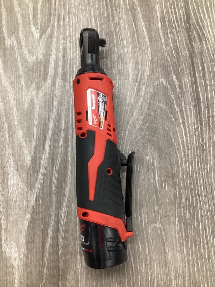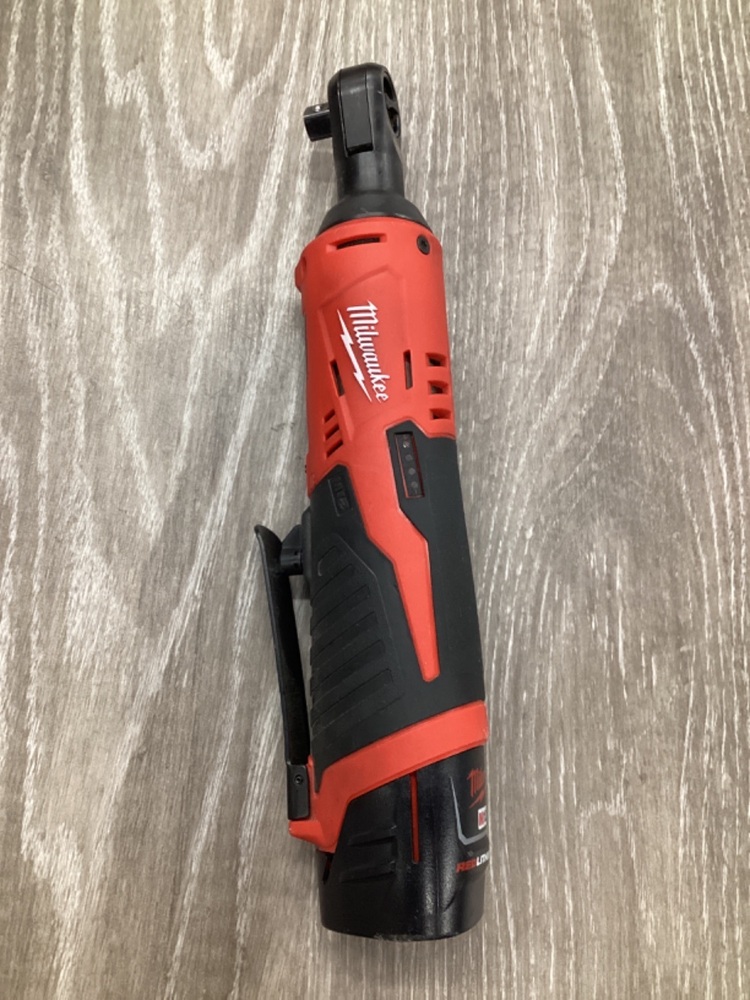 Milwaukee M12 3/8 Ratchet tool, includes battery but no charger. Ideal for DIY tasks and home repairs.