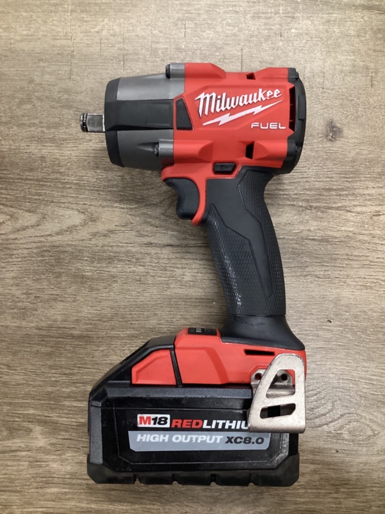 Milwaukee M18 Fuel Brushless 1/2" Mid-Torque Impact Wrench with M18 Red Lithium High Output XC 8.0 battery. A powerful, compact cordless tool known for its excellent power-to-weight ratio (650 ft-lbs nut-busting torque at 5.1 lbs with a 5.0Ah battery) and access in tight spaces due to its short 6" length, featuring a POWERSTATE brushless motor, Tri-LED lights, and 4-Mode DRIVE CONTROL with Auto Shut-Off and Bolt Removal modes for precise fastening in automotive and construction tasks.