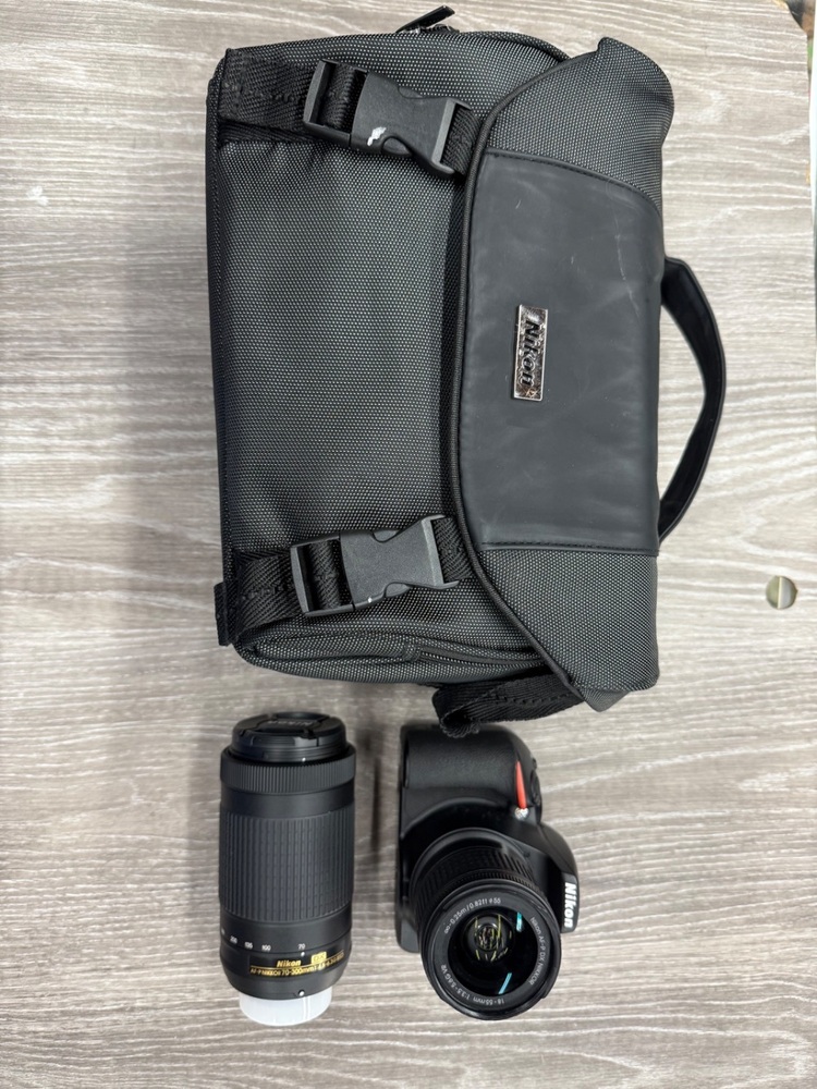 Nikon D3500 DSLR camera, includes versatile 18-55mm & powerful 70-300mm lenses. Package comes with Nikon camera bag and charger. Ideal for professional photography, capturing stunning detail.