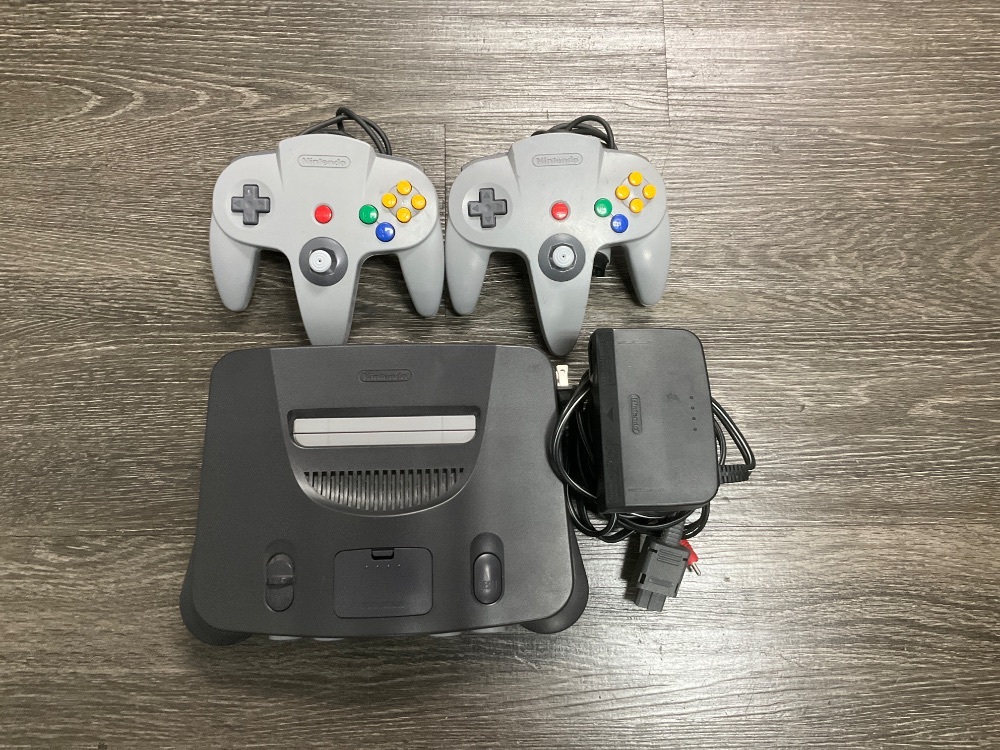 NINTENDO 64 WITH 2 CONTROLLERS, JUMPER PAK, AV CABLE, AND POWER SUPPLY