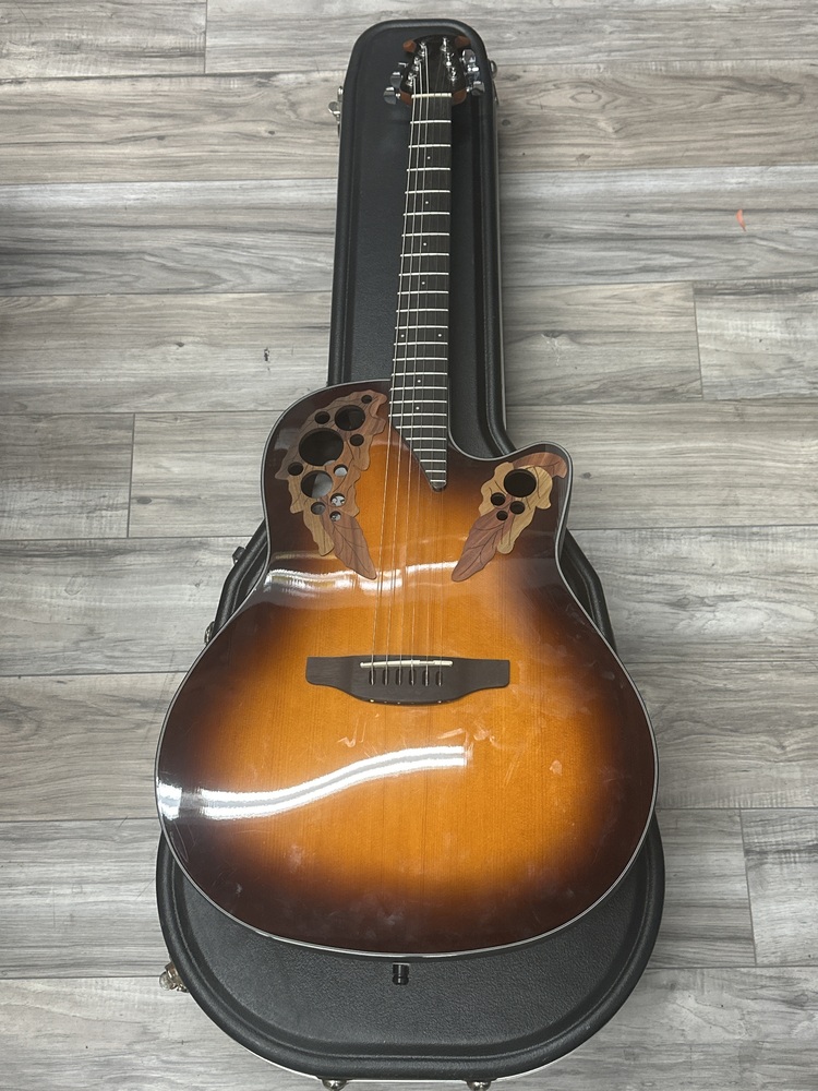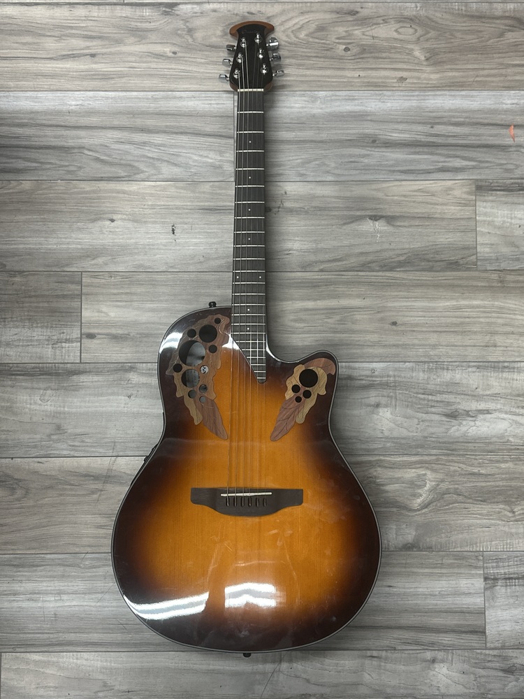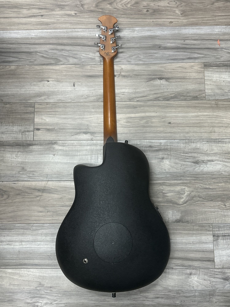 The Ovation CE44-1 A/E Guitar is a premium cutaway acoustic-electric guitar, featuring a solid spruce top, Lyrachord back, 25.25 scale rosewood fretboard, and Ovation Slimline pickup for superior sound quality. It also has an OP-4BT preamp system, built-in tuner, and is perfect for both studio recordings and live performances.