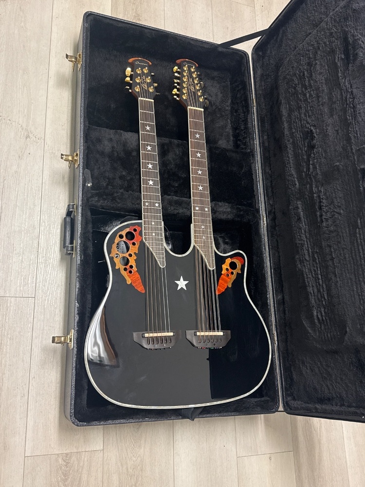 The Ovation Guitar E/A Guitar RSE225 is an exquisite double neck guitar designed for versatile play. It features an acoustic and an electric neck, to seamlessly switch between sounds. It's expertly crafted with innovative technology for a unique tonal quality. Comes with a protective case for safe storage and transport.