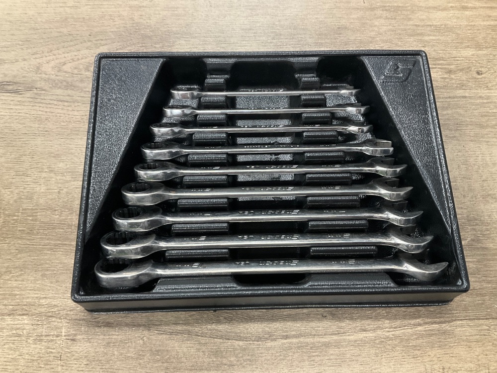 Tools Wrench SNAP ON OXRM12A ID: 11301541 9PC RATCHETING WRENCH SET. (MISSING 13) BLACK TRAY Loc: ZFLOOR