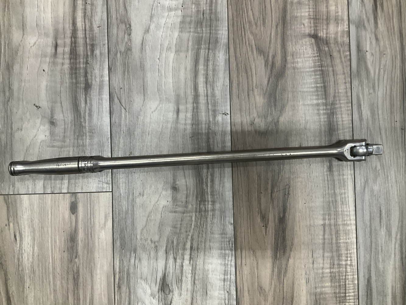 The Snap-On SN18A is a vintage 1/2 drive breaker bar, renowned for its robust construction. It features a 180-degree adjustable head for optimum flexibility and Snap-on's signature hard handle. The tool is forged from heat-treated alloy steel, delivering superior strength and durability. Suitable for high-torque applications.