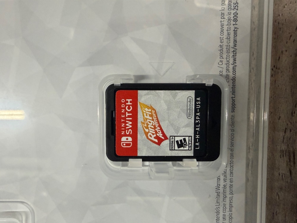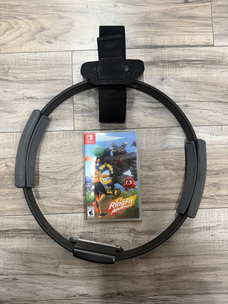 Experience immersive workouts with Nintendo Switch Ring Fit Adventure, including hand piece and leg strap for interactive fitness gaming.