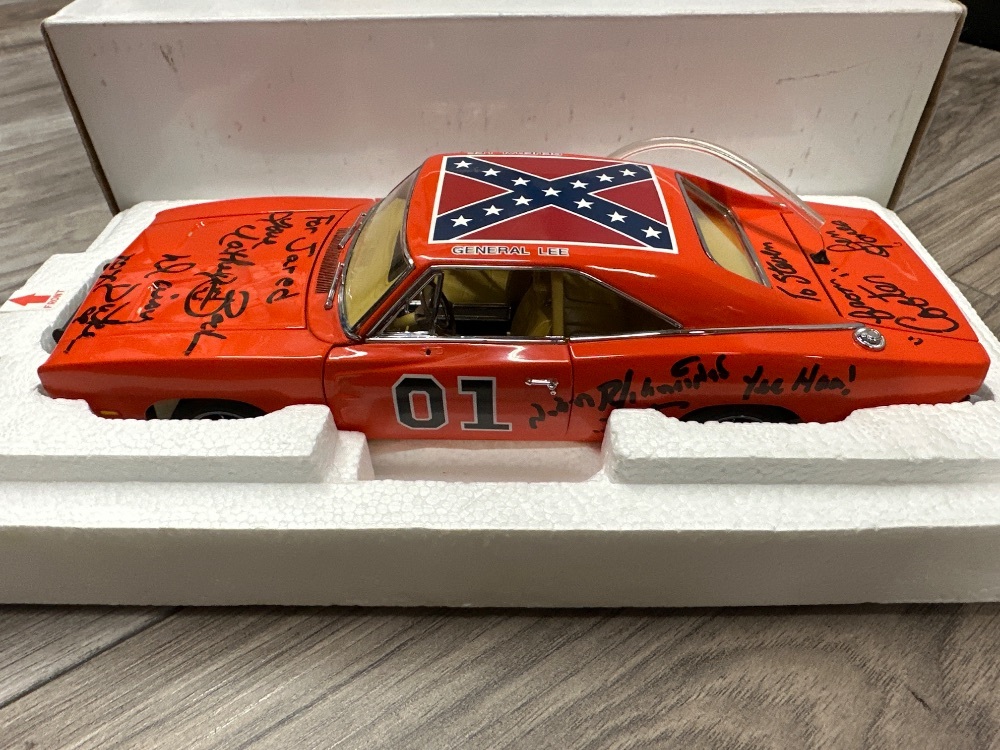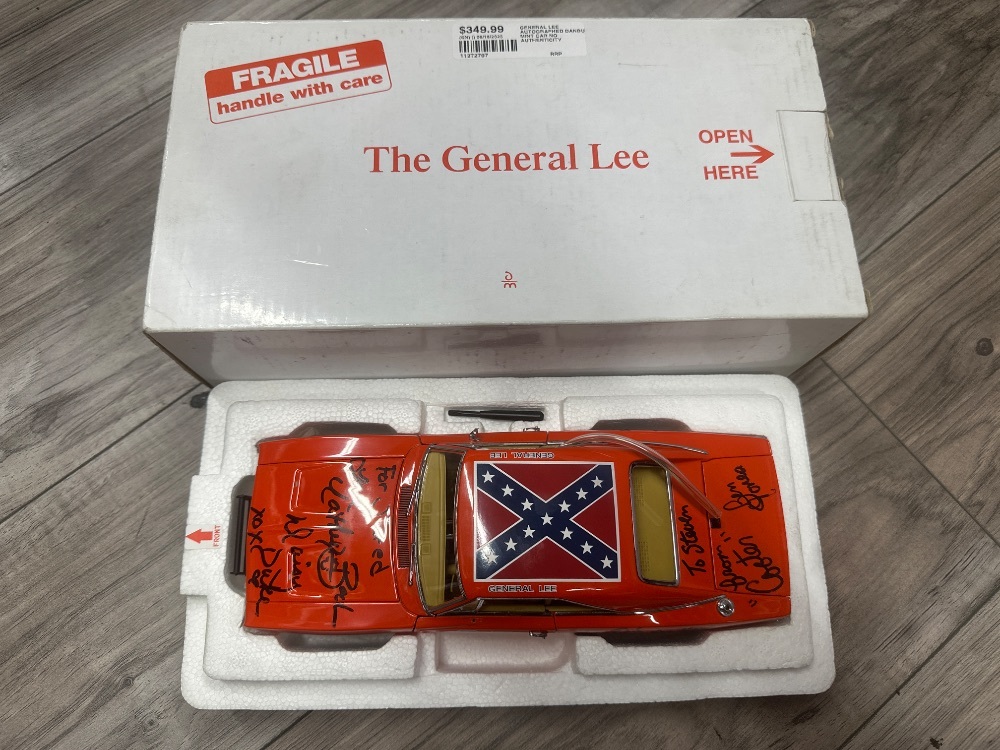 This is an autographed model of the General Lee car from Danbury Mint. Without an authenticity certificate, it's unclear who signed it. This item's value and collectability may be affected, especially for memorabilia collectors.