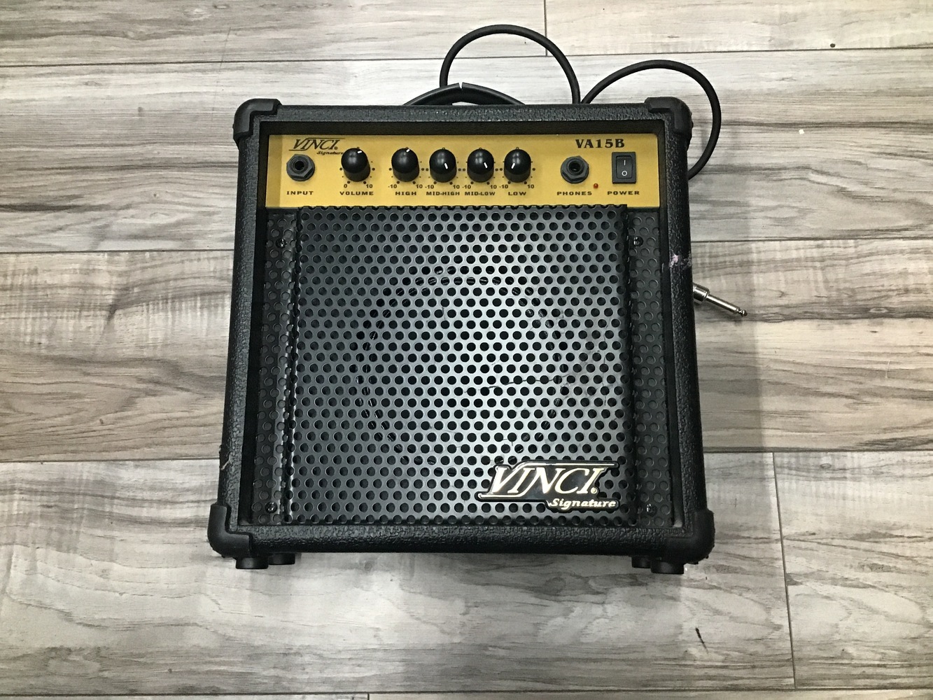 The Vinci VA15B guitar amp is a compact and portable instrument amplifier. It delivers a robust sound quality with its 15-watt power output. Perfect for practice sessions or small performances, it features easy-to-use controls for volume, tone, and gain adjustments.